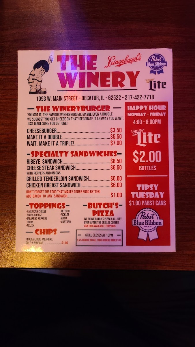 The Winery Bar menu offers a straightforward selection of familiar, satisfying fare and comforting drinks that fit a relaxed, small-town atmosphere. You’ll find classic bar staples like hearty burgers—with options like the Winery Burger loaded with everything or the Double Winery Burger with cheese—paired with casual sides and snacks such as Vicki's BBQ Chips. On the drink side, cold beers and well-crafted cocktails like the Bloody Mary complement the easy-going vibe.
